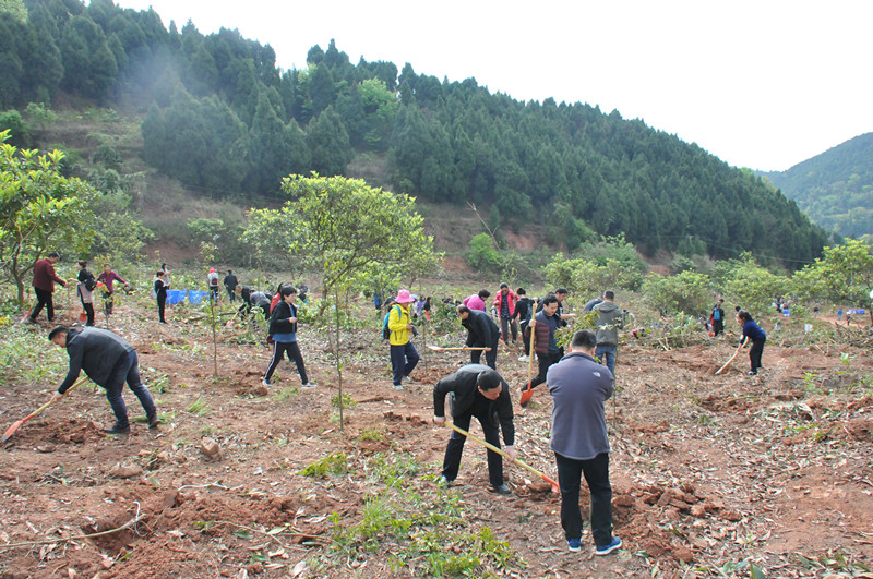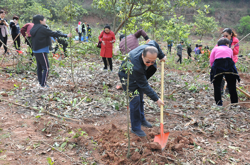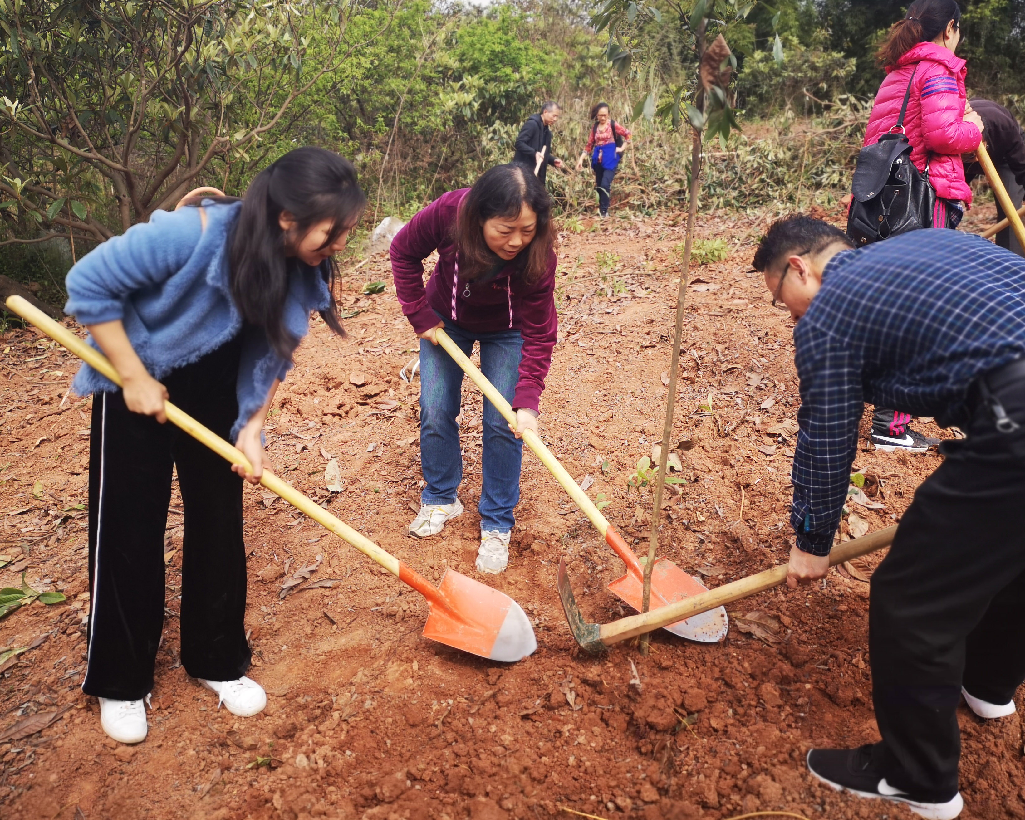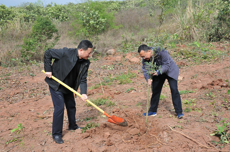 四月的龙泉山麓万物吐绿、春意盎然。校院党员干部和教职工步行到达划定的8号荒坡地后,立即投入了热火朝天的植树劳动中。两人、三人一组,相互配合,挖坑、放树苗、填土、浇水,在大家的齐心协力下,一个多小时就圆满完成了本次植树任务。