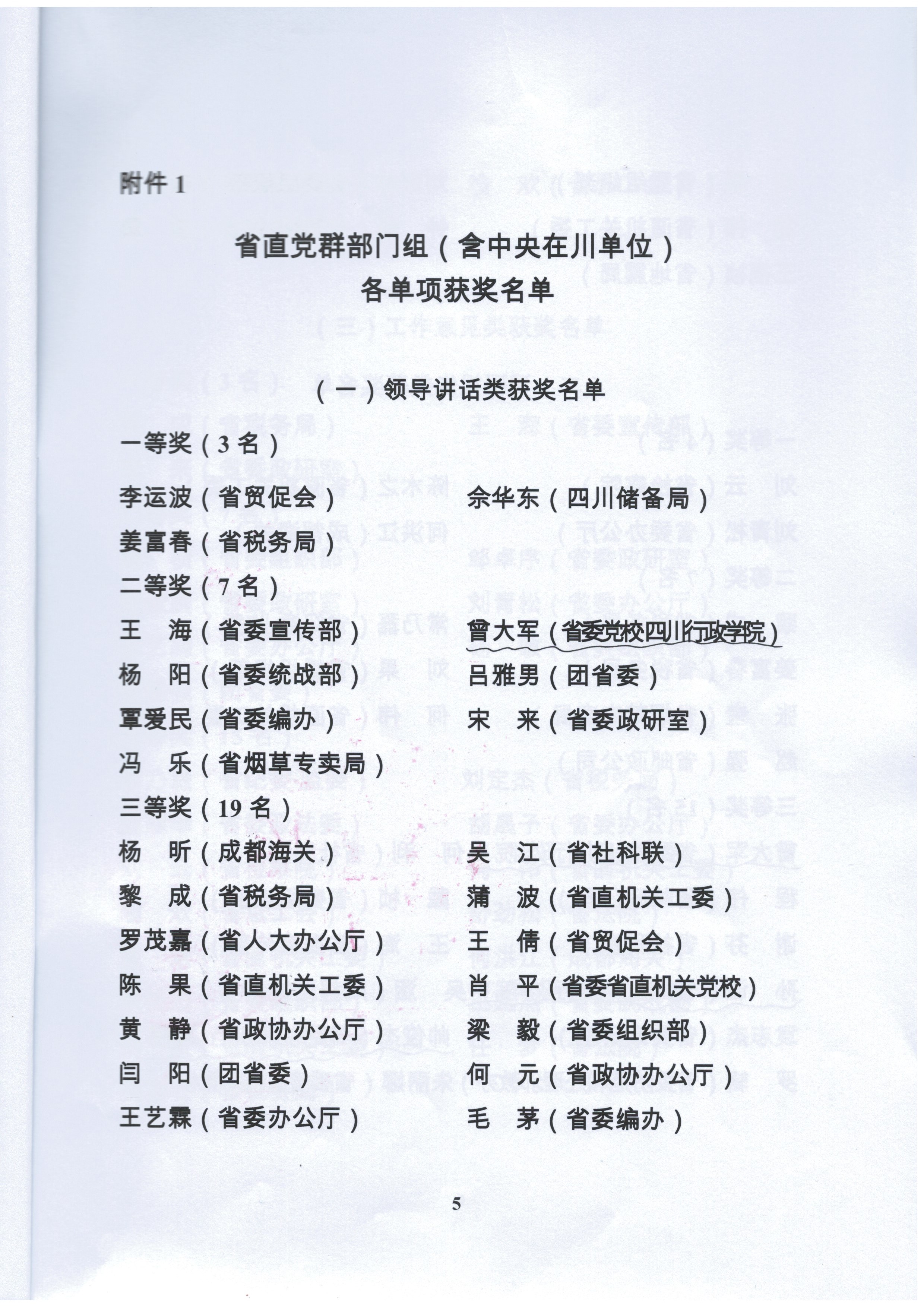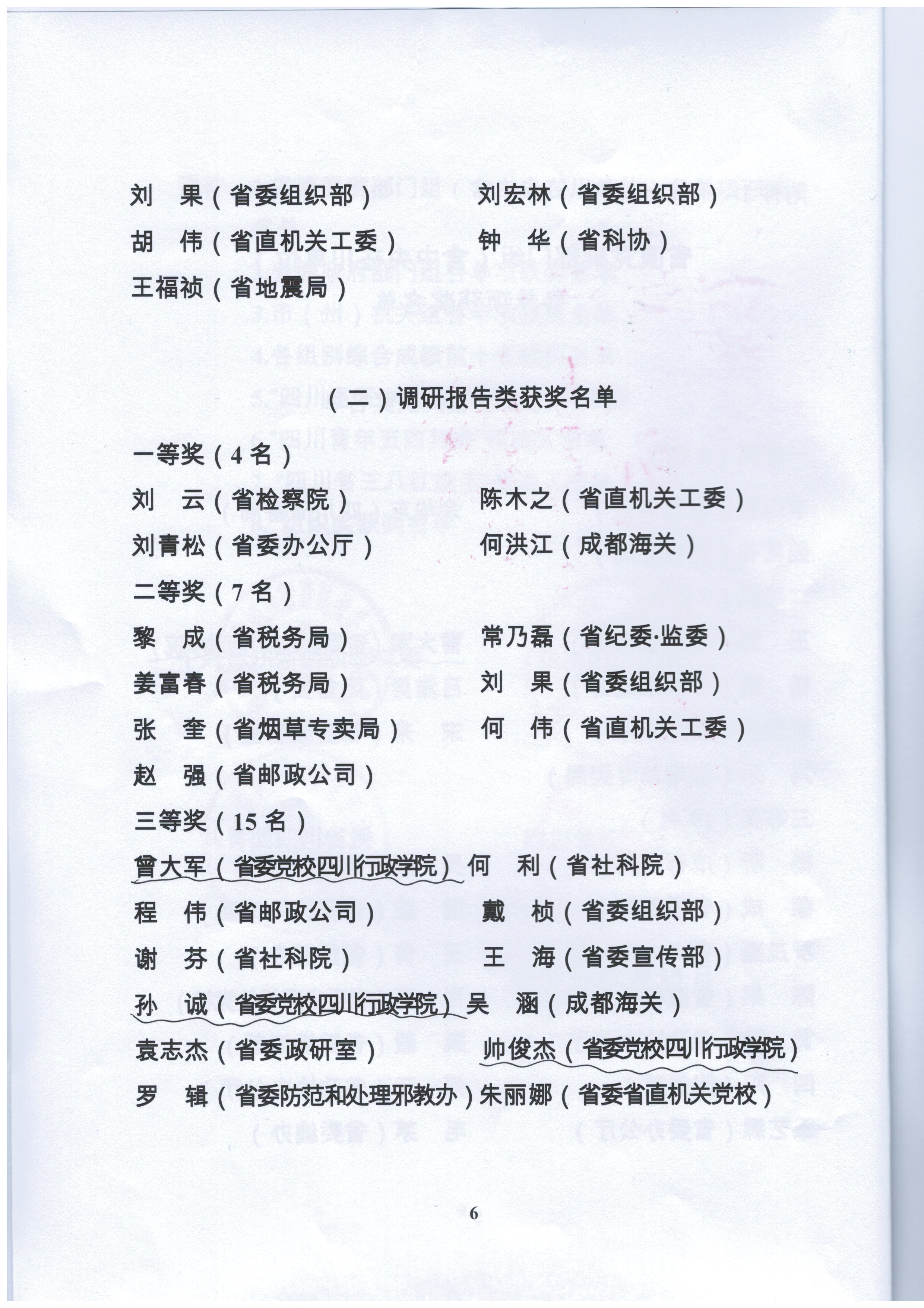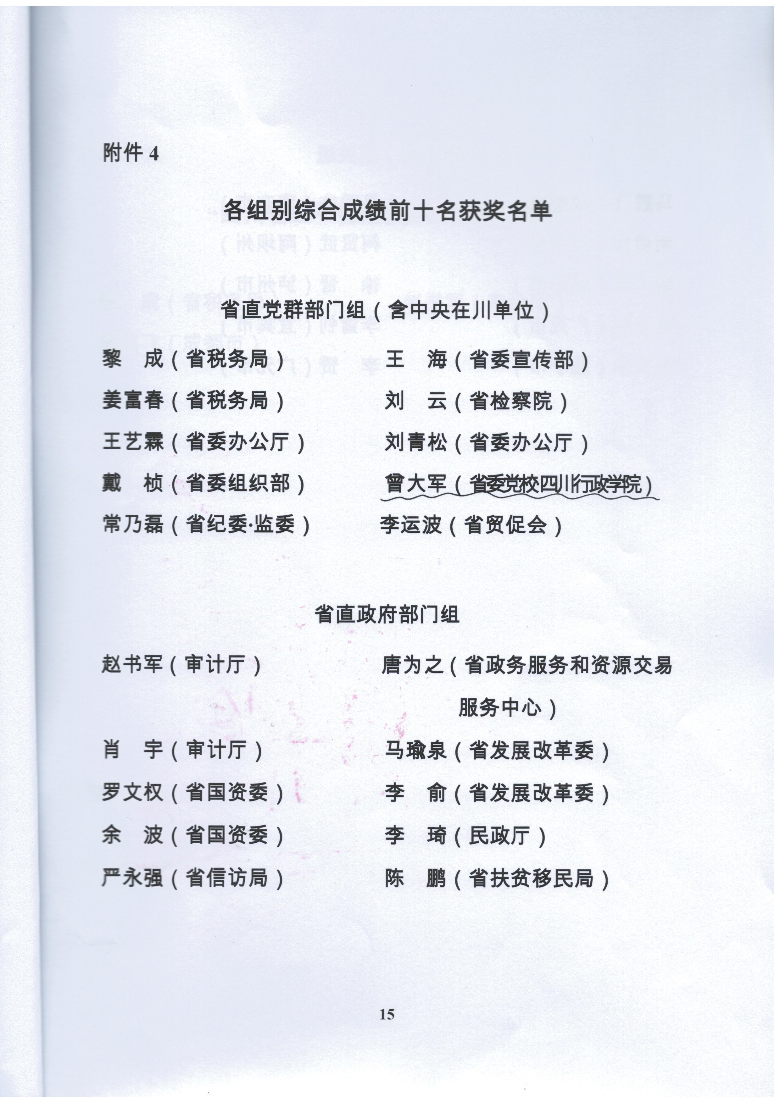 大赛围绕“立足岗位强本领·治蜀兴川作贡献”主题,分领导讲话、调研报告、工作意见三个专项写作比赛进行角逐。经过公平公正竞赛及严格规范评审,校院3名参赛选手脱颖而出。办公室曾大军同志荣获省直党群部门组(含中央在川单位)领导讲话类二等奖、调研报告类三等奖、综合成绩前十名,研究室孙诚同志、机关党委帅俊杰同志分别荣获调研报告类三等奖。校院荣获大赛组织奖。