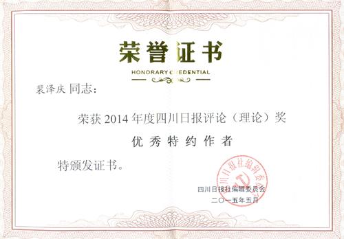 据悉,最近四川日报首次举办2014年度评论(理论)奖评选活动,全省共评选出优秀特约作者两名,四川省委党校、四川行政学院副校(院)长裴泽庆教授获此殊荣。
