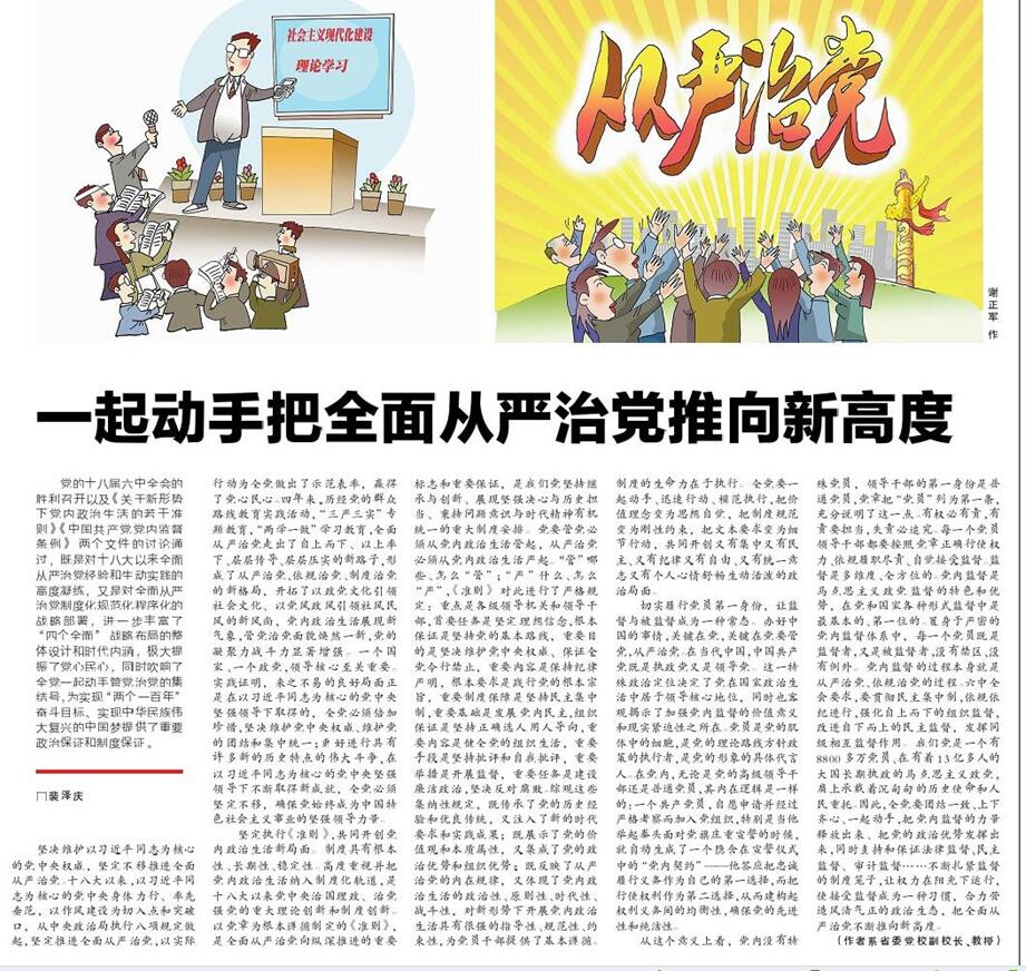 11月9日,《四川日报》理论创新版(06版)刊发校院副校长裴泽庆教授学习党的十八届六中全会精神理论文章《一起动手把全面从严治党推向新高度》。