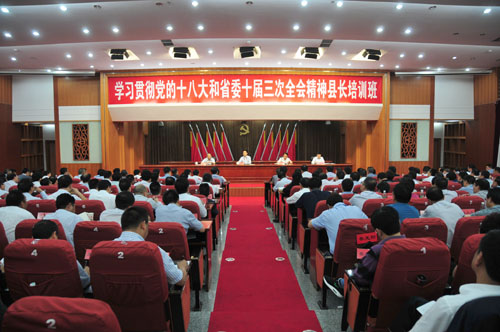 9月12日,“学习贯彻党的十八大和省委十届三次全会精神县长培训班”开班式在我校举办,省委副书记、省长魏宏出席开班式,就《打造县域经济升级版担当跨越发展新使命》与全省183名县长进行交流,给学员提出一组问题,希望大家深入研究当前发展面临的新情况,全面把握和履行政府职能,切实担当起打造县域经济升级版,推进新一轮发展跨越的新使命。省委常委、组织部部长、党校校长范锐平主持开班式。省委党校常务副校长刘毅、省委组织部副部长戴允康出席开班式。