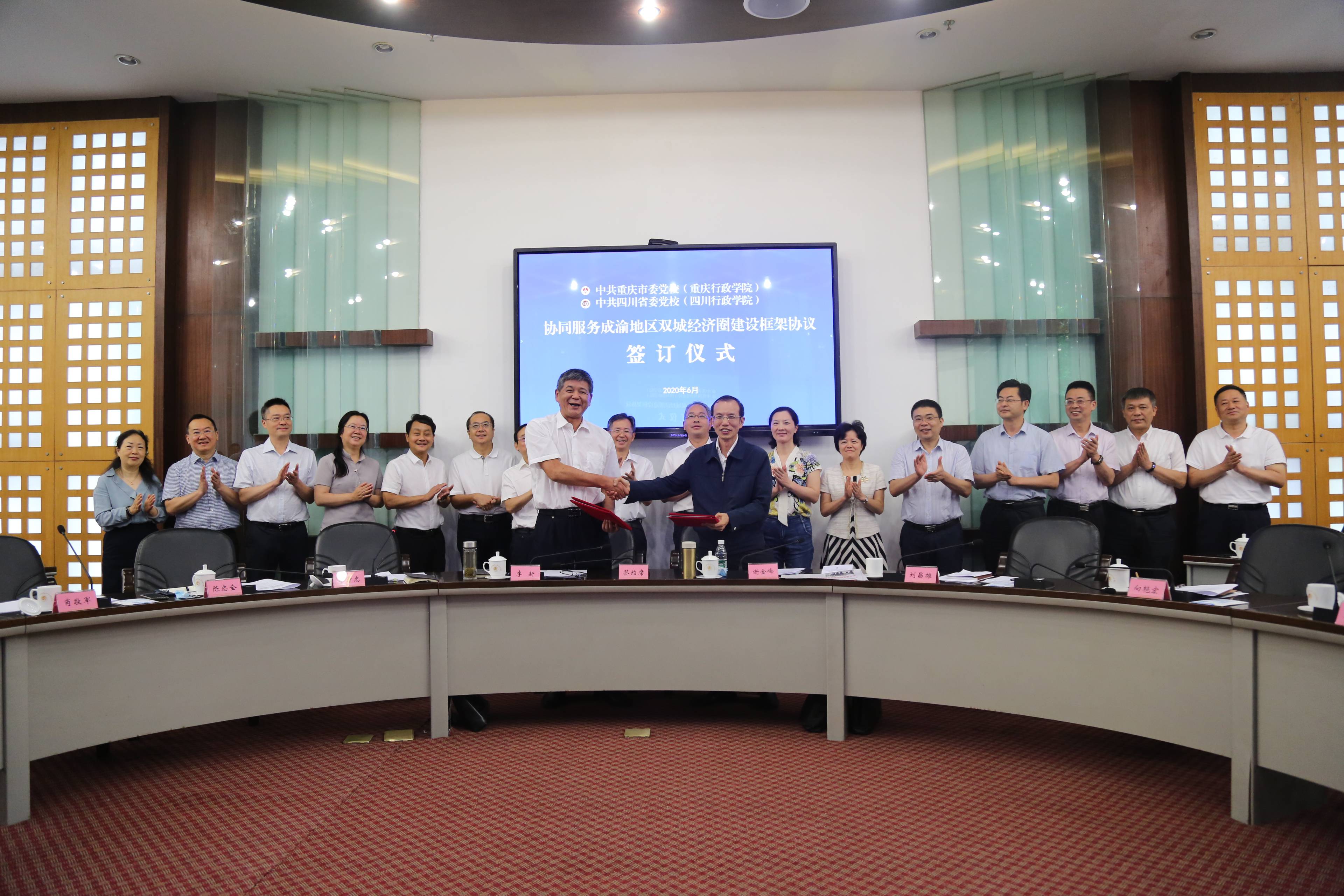 六月的党校校园艳阳高照,草木葱茏。加快推动成渝地区双城经济圈建设是以习近平同志为核心的党中央作出的重大战略部署,四川省委、重庆市委多次召开会议系统谋划工作安排。6月18日上午,川渝党校协同服务成渝地区双城经济圈建设框架协议签订仪式暨理论研讨会在我校圆桌会议室举行。李新和谢金峰分别代表两校签署协议。