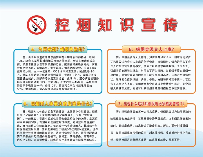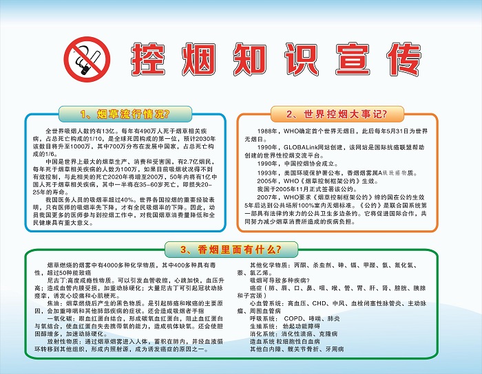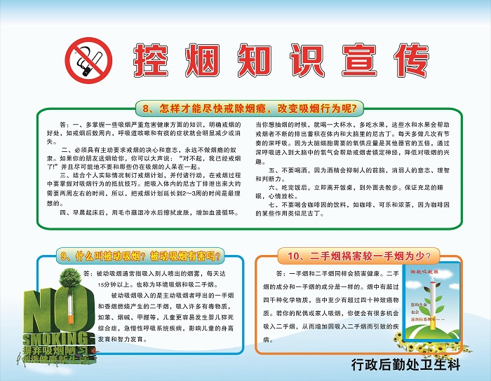 近日,行政后勤处在校(院)宣传窗推出了《控烟知识宣传》专栏,从烟草流行情况、吸烟为什么会上瘾、吸烟及二手烟对人体的危害、怎样才能尽快戒除烟瘾、改变吸烟行为等10个方面进行宣传。下步我们还将结合单位实际,通过微信、宣传栏、讲座、知识竞赛等多种形式开展烟草危害科普知识、戒烟方法、戒烟服务信息等宣传,并将组织控烟、戒烟监督检查,营建人人支持、人人享有、人人参与的良好氛围,确保2022年底校(院)创建无烟单位目标如期实现。