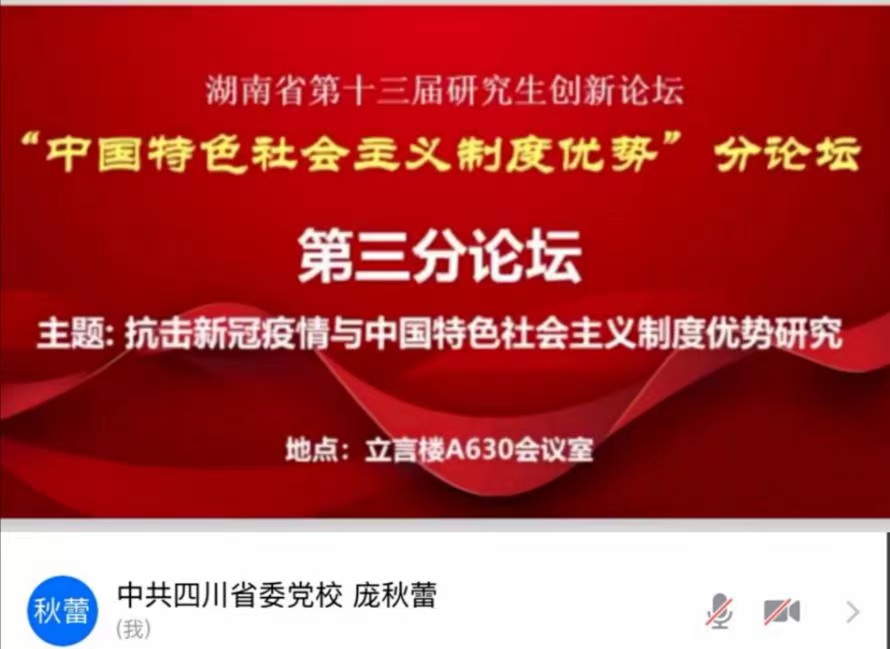 12月3日由湖南科技大学承办的湖南省第十三届研究生创新论坛召开,论坛聚焦“中国特色社会主义制度优势”主题,来自全国各地知名专家学者和优秀青年学者共同进行研讨。本次论坛以线下和线上两种方式同时进行,我校马克思主义学院陈仲教授指导的2019级马克思主义基本原理专业硕士研究生庞秋蕾同学获得优秀论文二等奖,并受邀线上参加“第三分论坛:抗击新冠疫情与中国特色社会主义制度优势研究”。