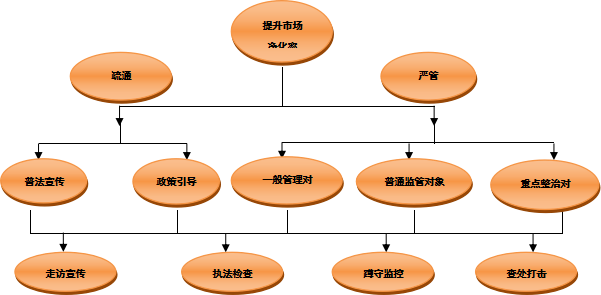 所谓“1234”监管模型是指着眼于“提升市场净化率”这一个目标,从“疏通、严管”两个基本面出发,把监管对象分成一般管理对象、普通监管对象和重点整治对象这三类,运用走访宣传、执法检查、蹲守监控、查处打击等四种手段有效开展市场监管。