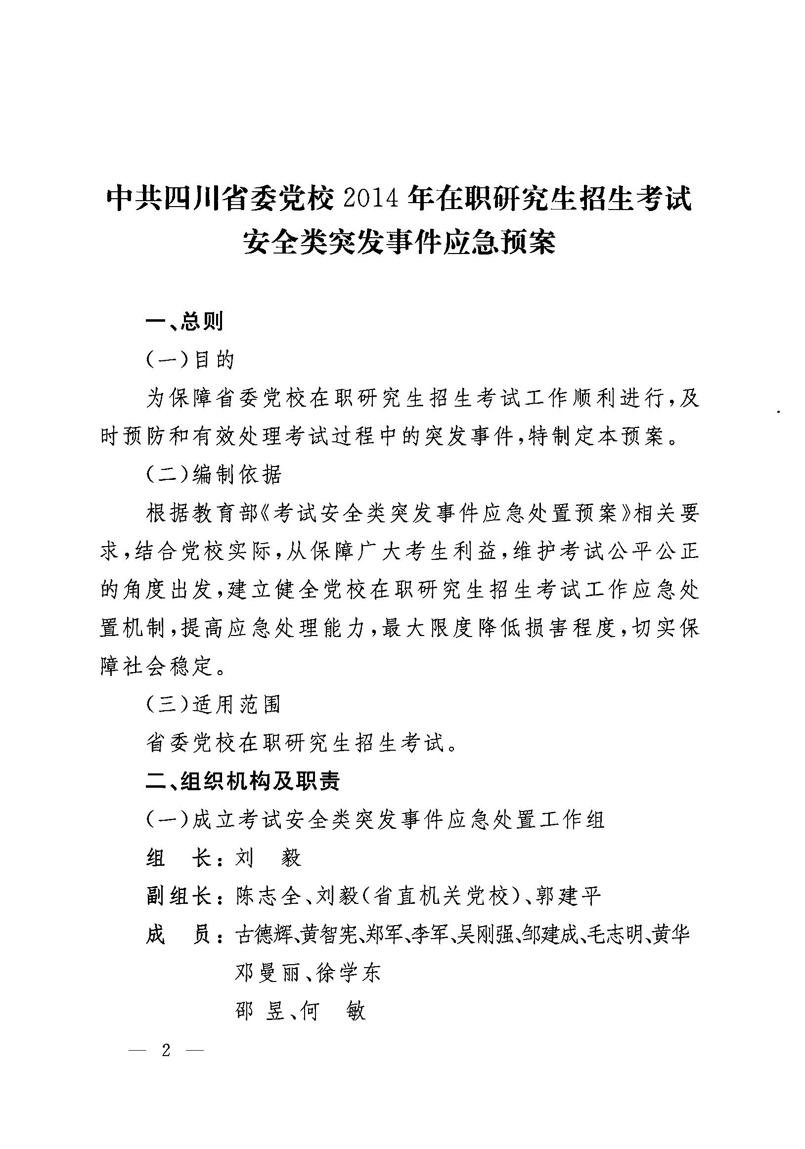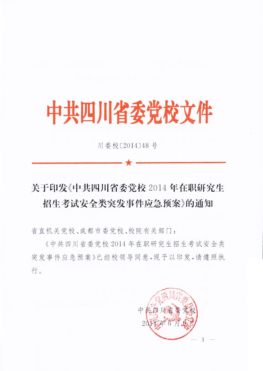 关于印发《中共四川省委党校2014年在职研究生招生考试安全类突发事件应急预案》的通知