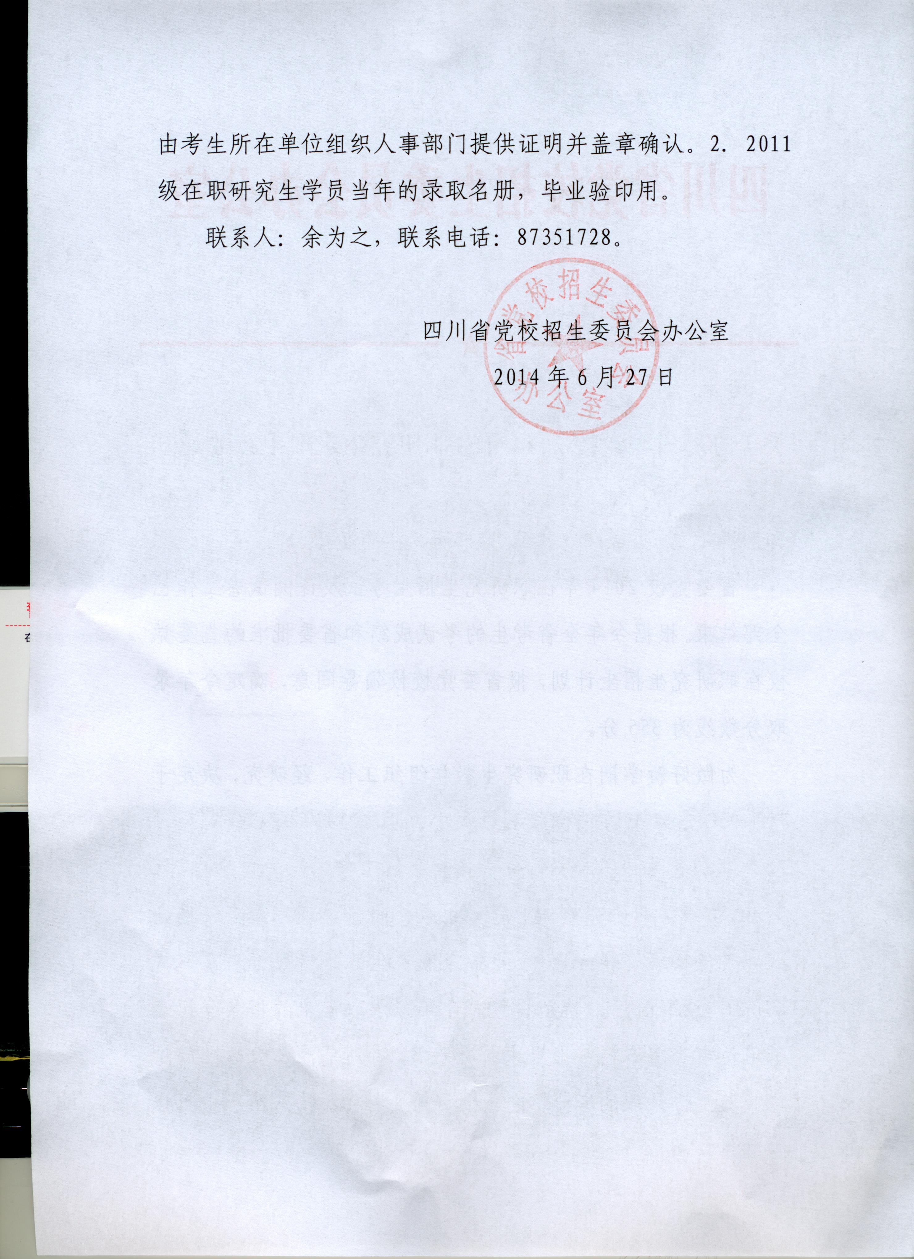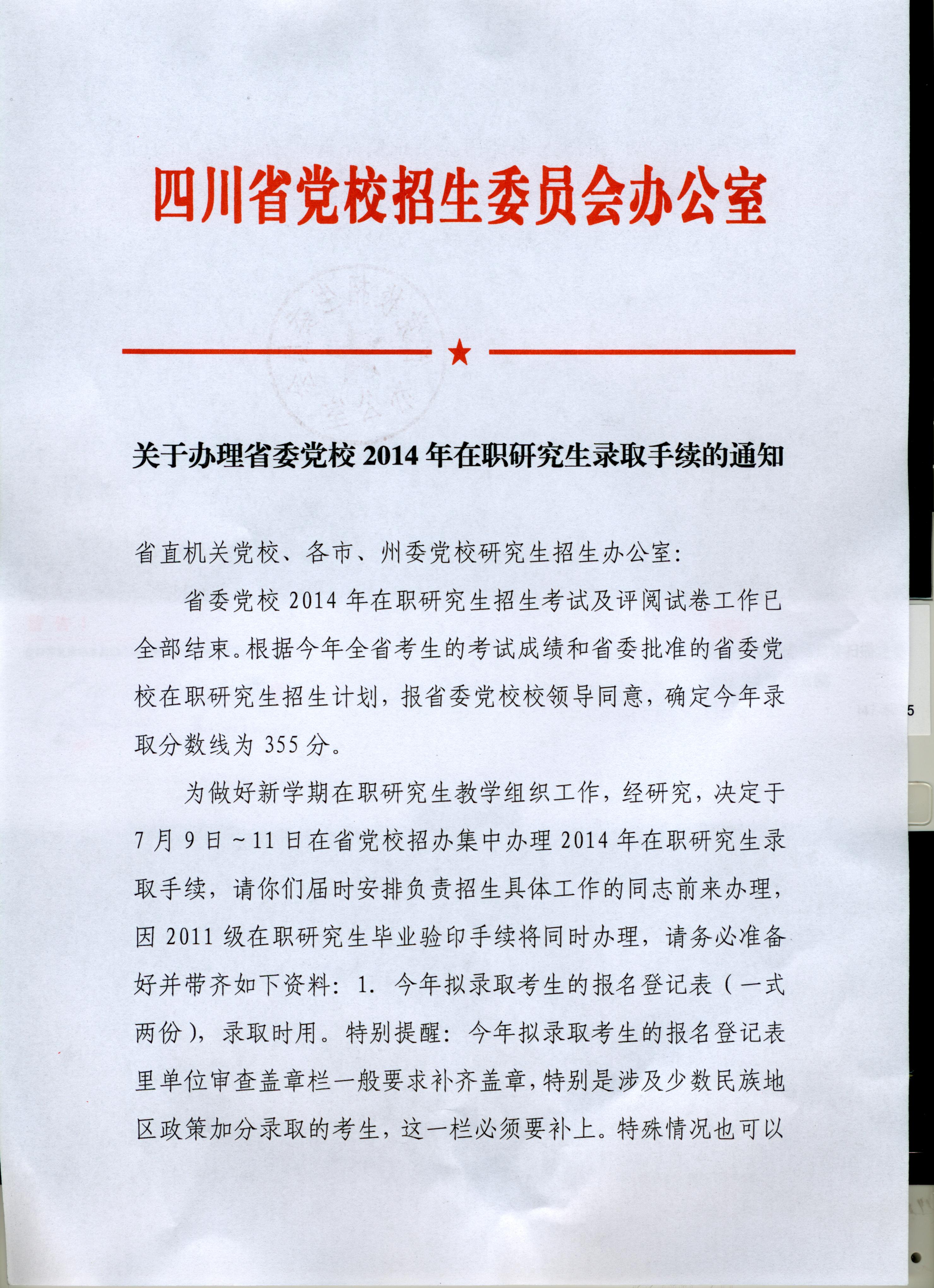 关于办理省委党校2014年在职研究生录取手续的通知
