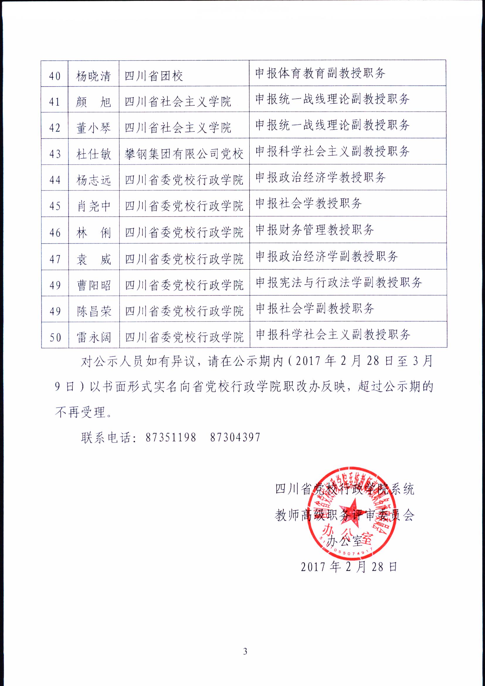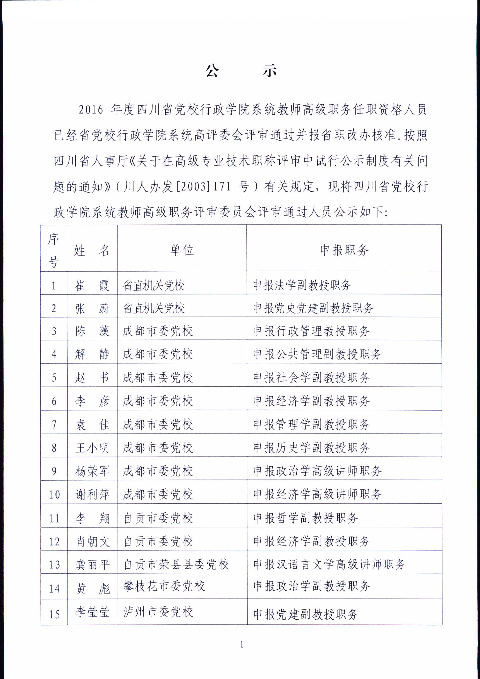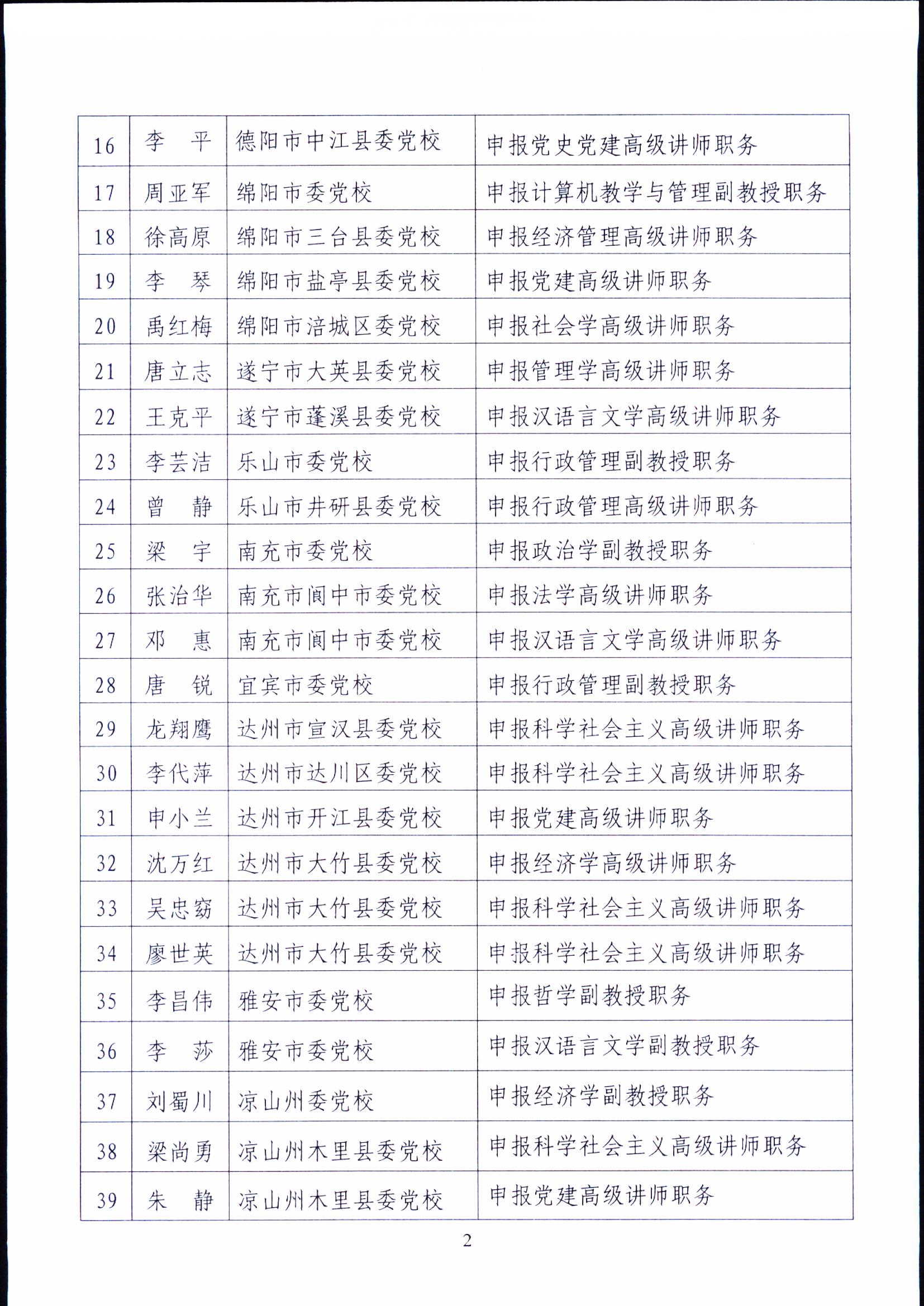 2016年度四川省党校行政学院系统教师高级职务任职资格评审通过人员公示
