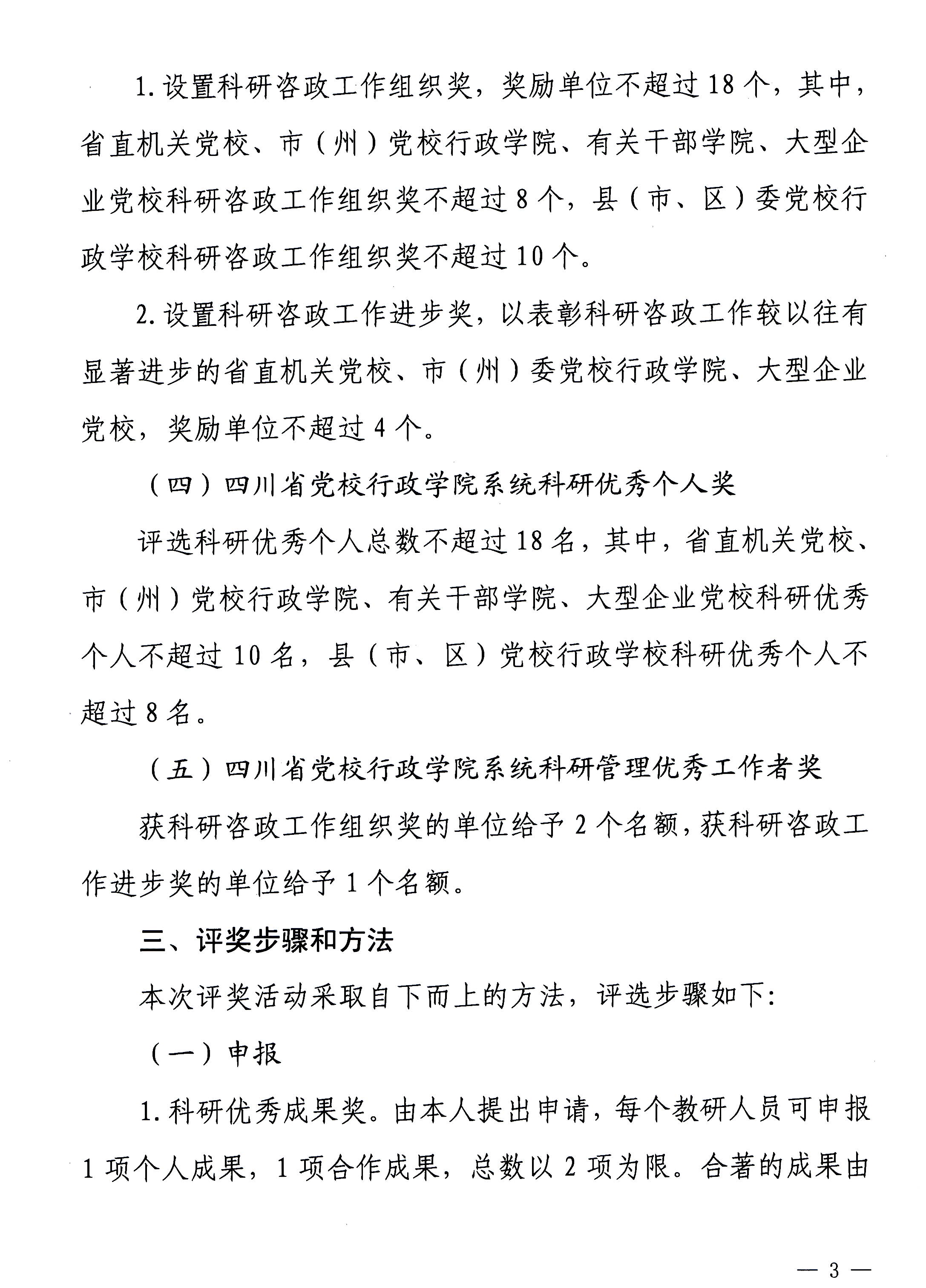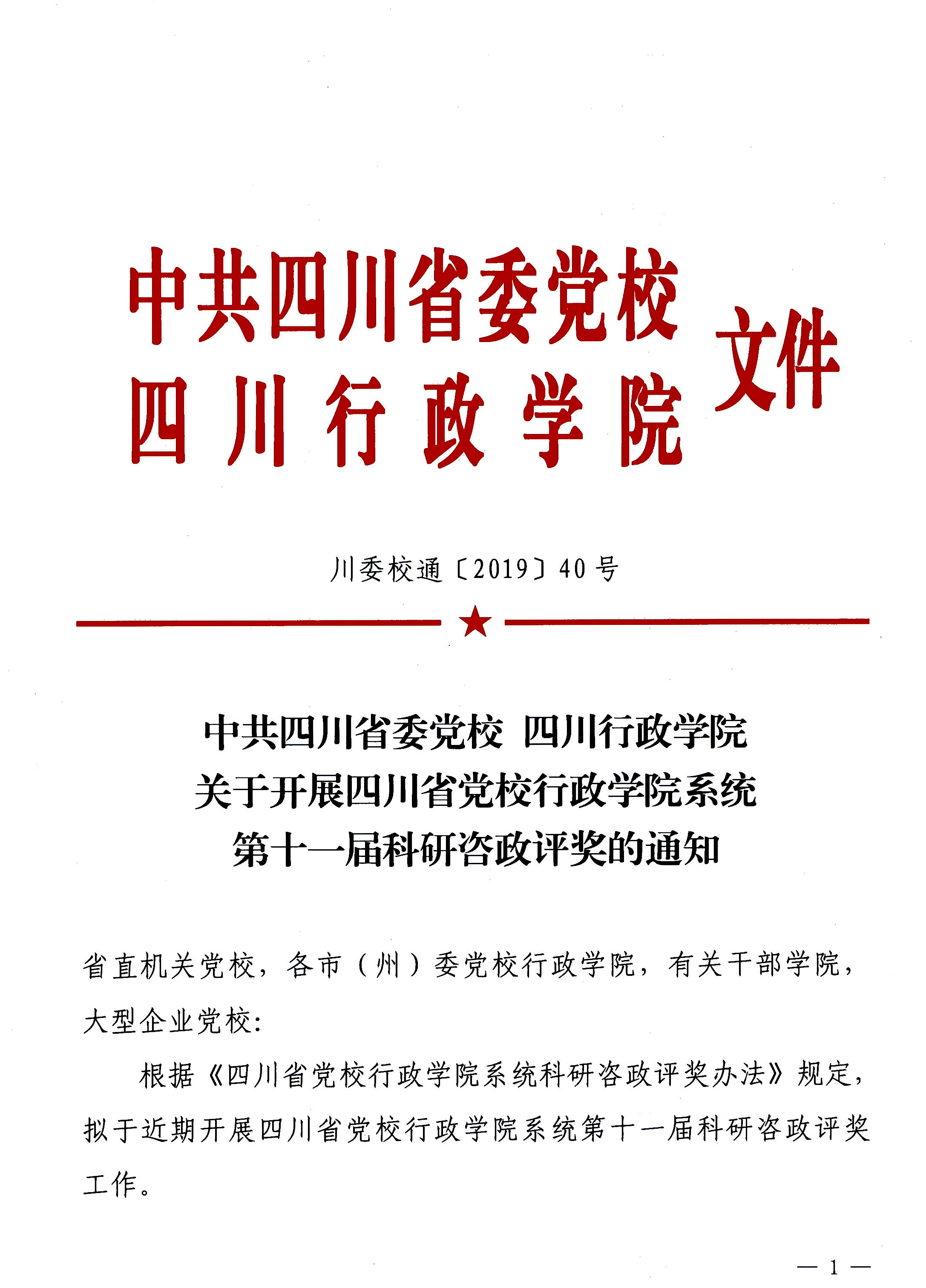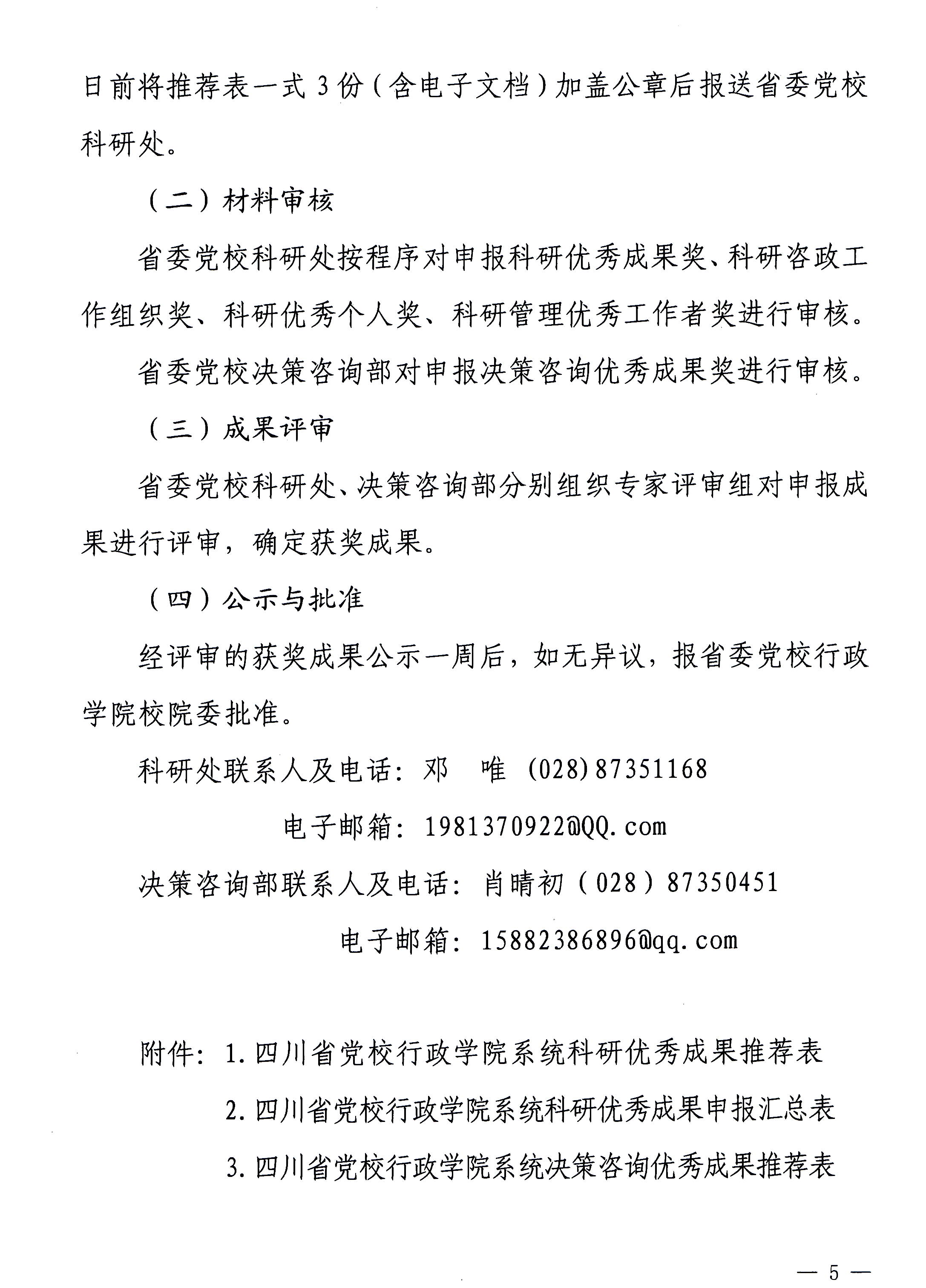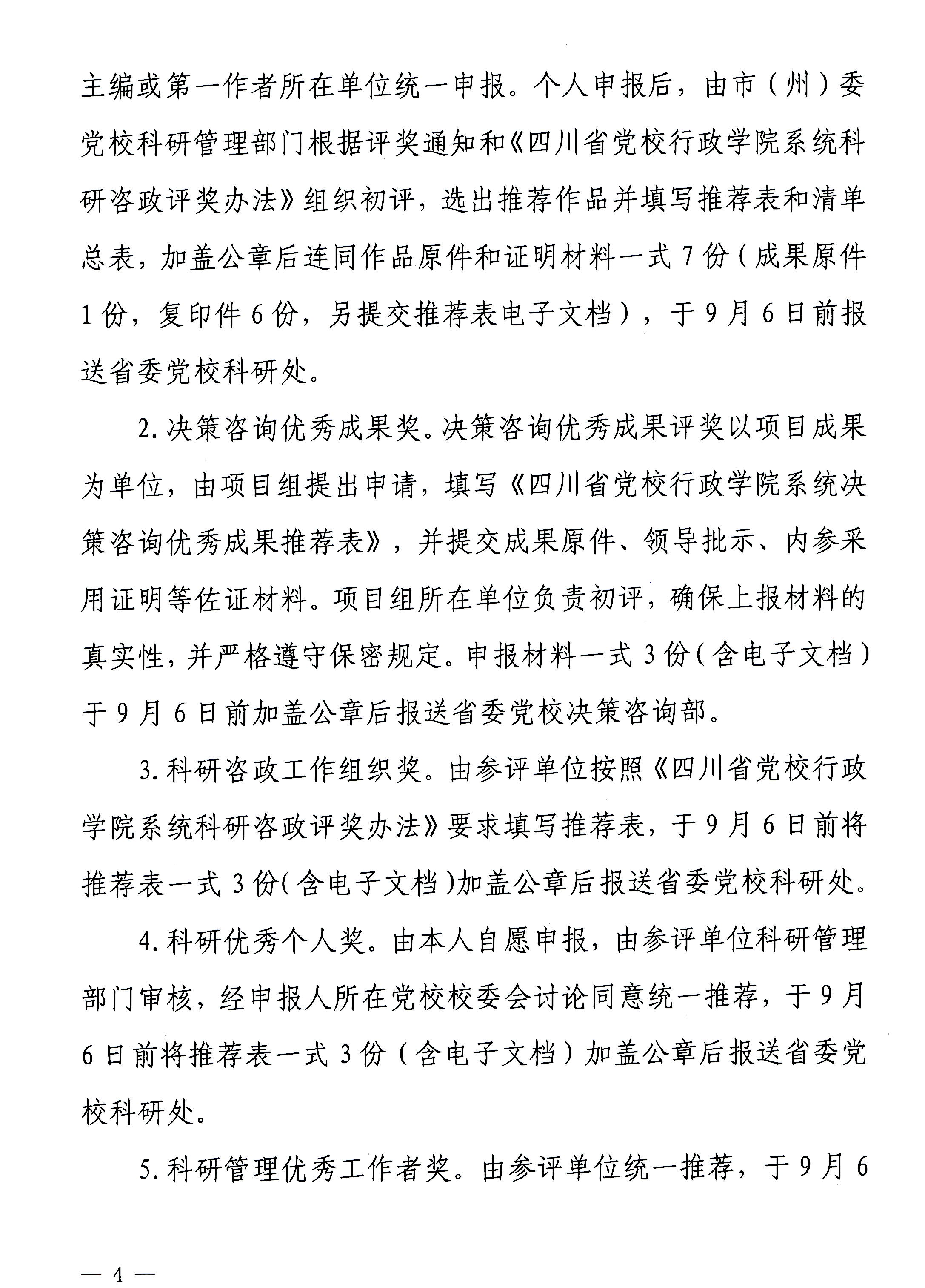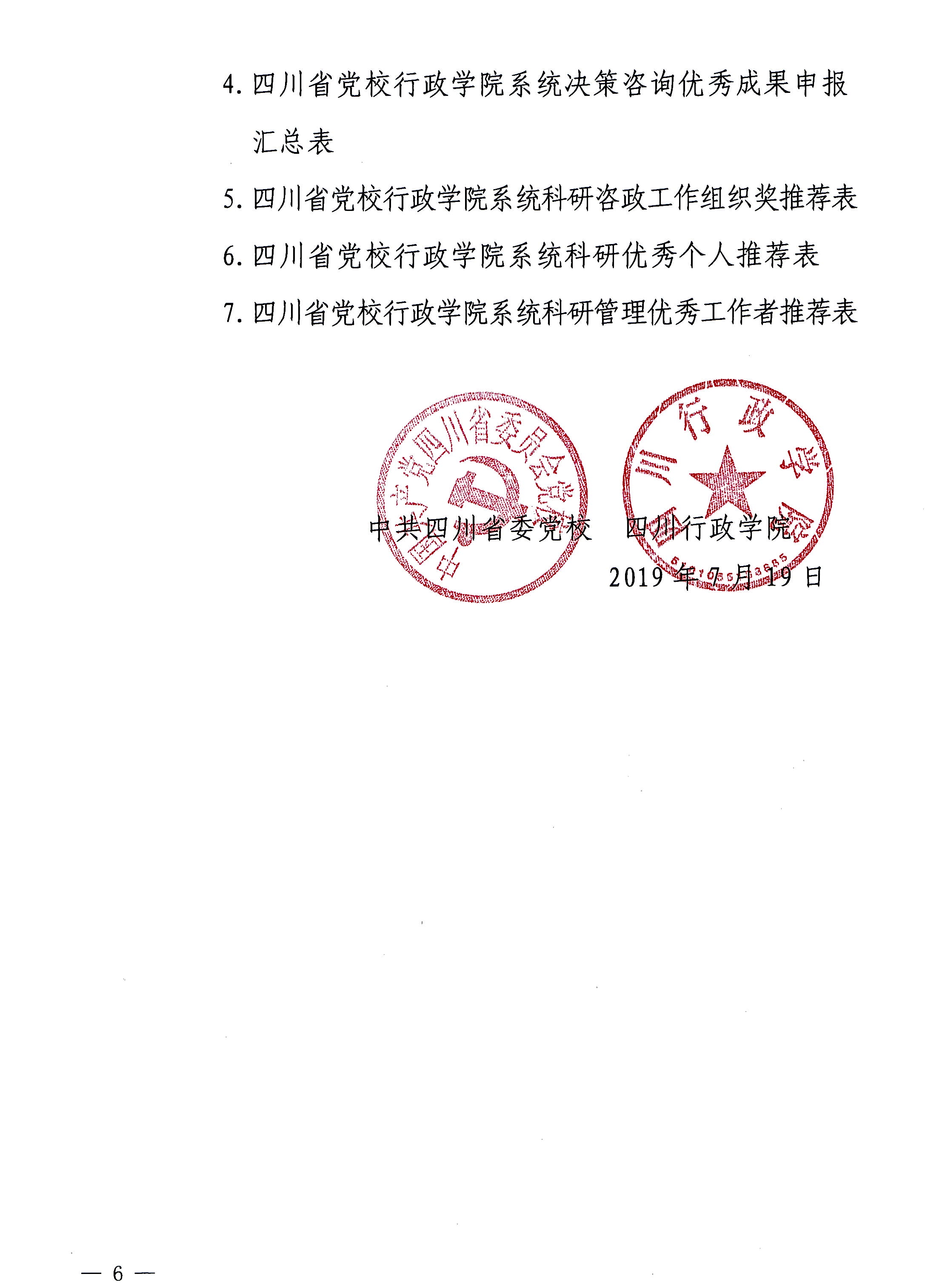 附件:1.四川省党校行政学院系统科研优秀成果推荐表;2.四川省党校行政学院系统科研优秀成果申报汇总表;3.四川省党校行政学院系统决策咨询优秀成果推荐表;4.四川省党校行政学院系统决策咨询优秀成果申报汇总表;5.四川省党校行政学院系统科研咨政工作组织奖推荐表;6.四川省党校行政学院系统科研优秀个人推荐表;7.四川省党校行政学院系统科研管理优秀工作者推荐表