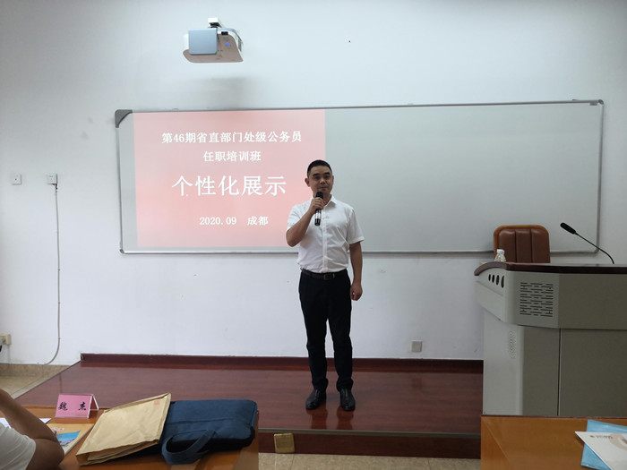 下午,在蜀华教学楼402教室开展班会活动。在个性化展示环节,学员们依次走上讲台,用简练的语言对自己的基本信息、工作经历、个性特点等做了介绍,在短短三分钟时间内快速勾勒出自我形象。或严谨或飞扬,或诙谐或诗意,学员们各具特色的展示迅速拉近了彼此距离,教室内不时响起阵阵掌声和欢声笑语。学员们纷纷表示要珍惜这次培训机会,以学益智、以学修身、以学增才,不断提升政治品质,强化担当作为,为开创四川高质量发展新局面,推动治蜀兴川再上新台阶贡献智慧和力量。